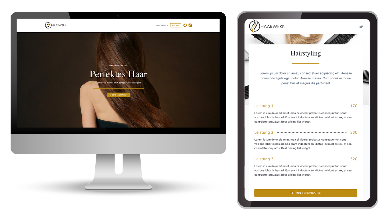 Deine Internetseite ist deine Visitenkarte im Netz. Deshalb solltest du sie nicht dem Zufall überlassen, sondern uns vertrauen. Du suchst dir eine Vorlage und wir erstellen dir eine hochwertige Seite, die zu dir passt und dich überzeugt. Und das ohne hohe Anschaffungskosten, sondern mit einer flexiblen Miete. Pflege und Wartung kannst du im Anschluss uns überlassen, so dass du den Kopf frei für dein Business hast.